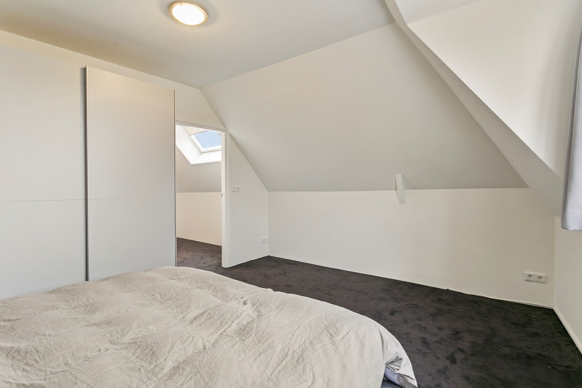 De tweede verdieping is te bereiken middels een vaste trap. Vanuit de overloop krijg je toegang tot twee ruime slaapkamers, een aan de voorzijde en een aan de achterzijde van het pand. De luxe badkamer is voorzien van een inloopdouche, zwevend toilet en wastafel met -meubel.